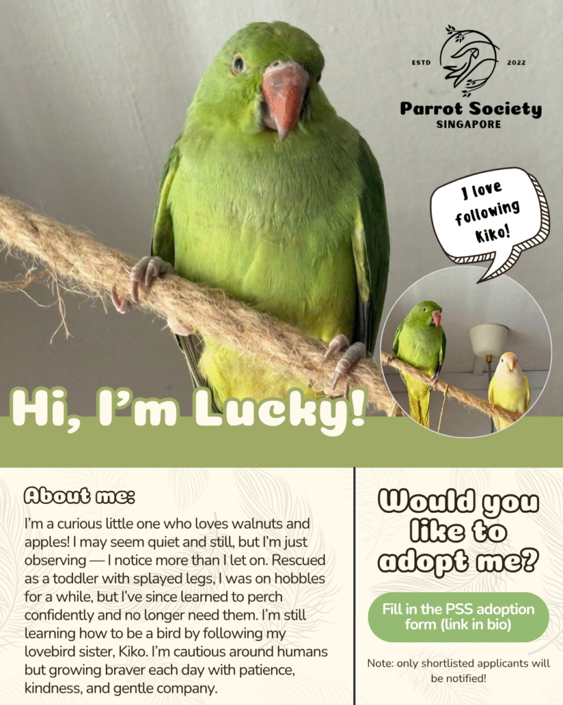 If you’re ready to commit to Lucky’s journey, please apply here: https://parrotsocietysg.org/adopt/