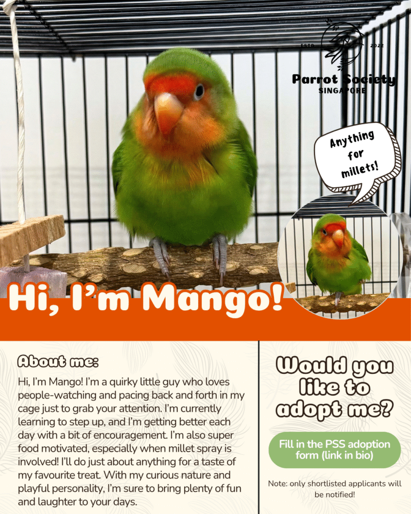Apply now via our website: https://parrotsocietysg.org/adopt/