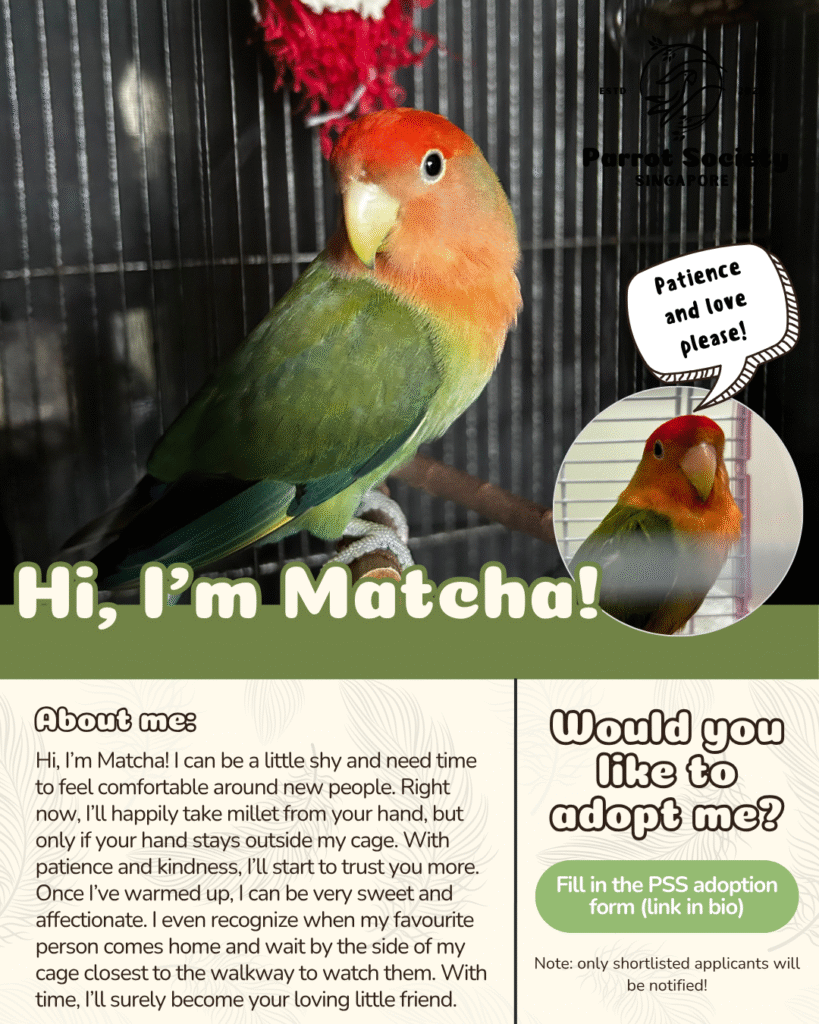 Apply now via our website: https://parrotsocietysg.org/adopt/