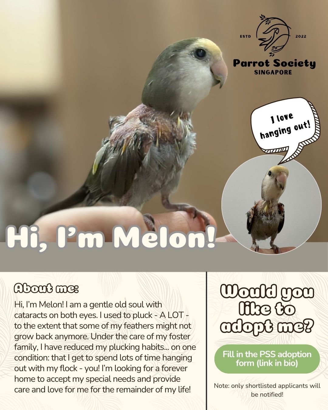Apply now via our website: https://parrotsocietysg.org/adopt/