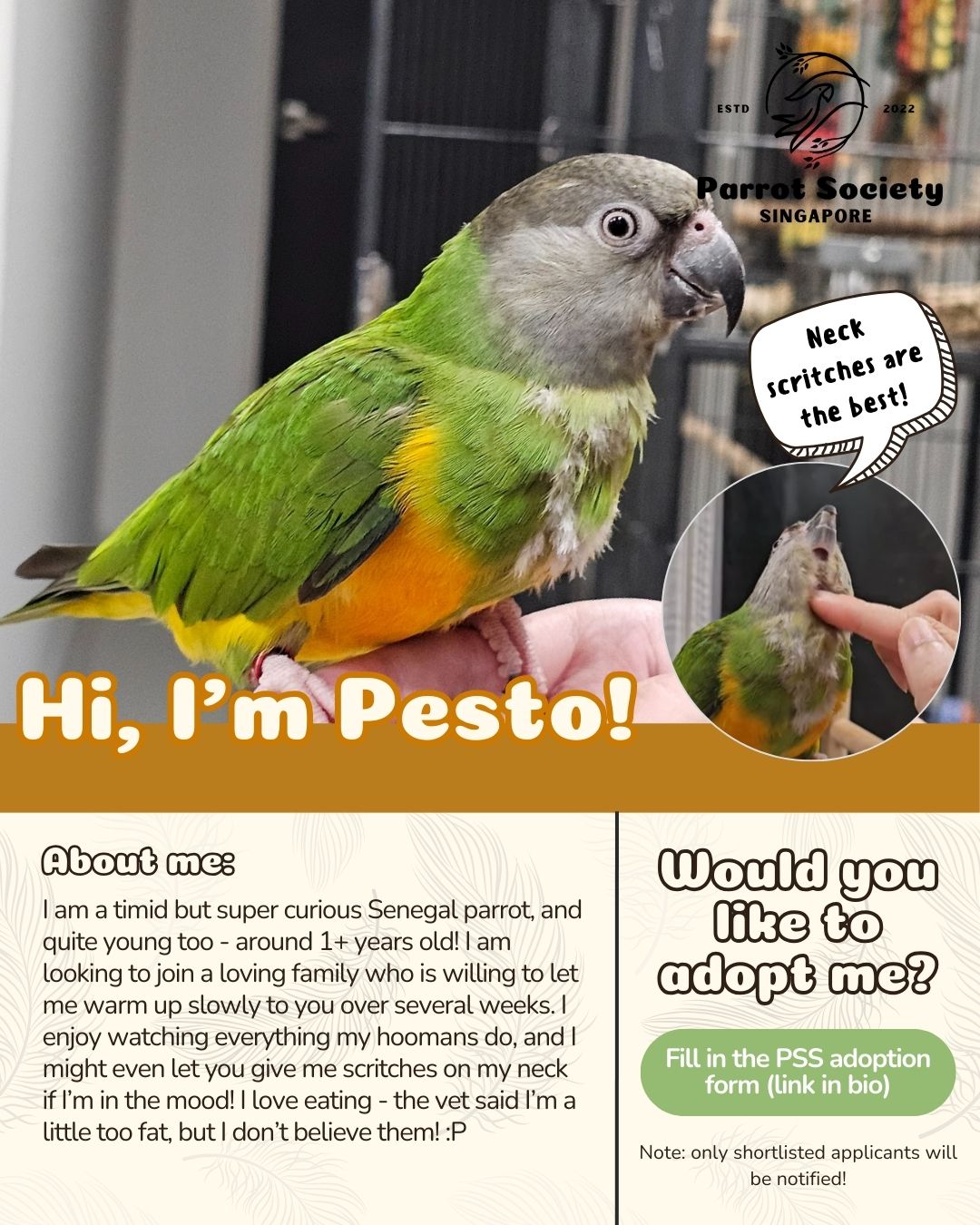 Apply now via our website: https://parrotsocietysg.org/adopt/