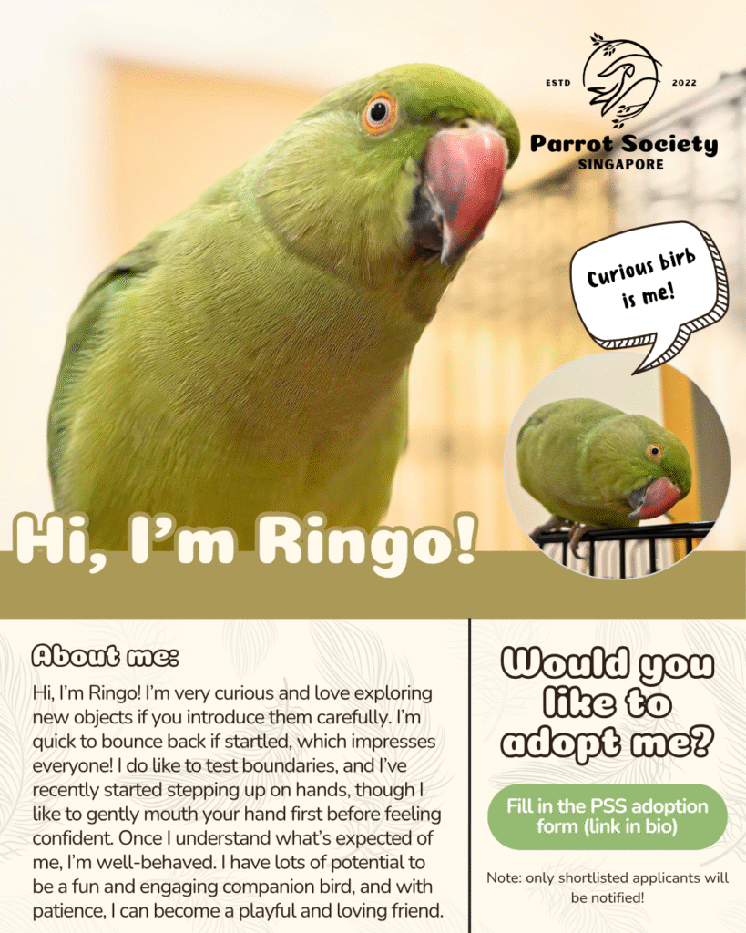 Apply now via our website: https://parrotsocietysg.org/adopt/